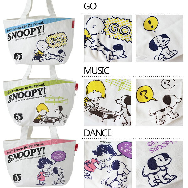 何にでも合わせやすカジュアルなバッグは、持っていて損はなし! チャーリー・ブラウンとスヌーピーが走る“GO” ピアノを弾くシュローダーと音楽にのるスヌーピーの“MUSIC” ルーシーとスヌーピーが楽しそうに踊る“DANCE”のバリエーション。